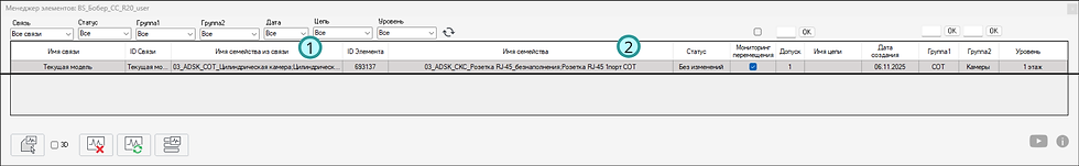 Если связь подгружена (см. Рис.3), то в "Менеджере мониторинга" для строк (№1 и №2) отобразится полная информация о состоянии семейств из столбца (1) и столбца (2).