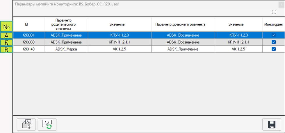 Активирован мониторинг параметров. Выбранные параметры между семействами совпадают. (Зеленый цвет в столбце А для строки №3).
